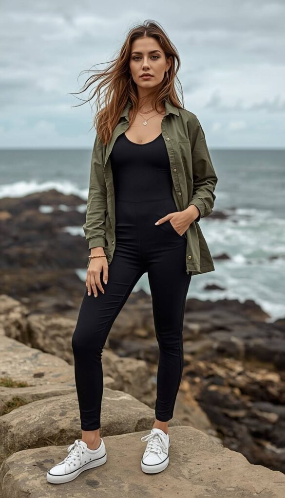 A black high-waisted leggings-style jumpsuit (sleek fit, ankle-length) layered under an olive-green utility jacket (notched collar, roll-up sleeves, front pockets), styled with white platform sneakers, a delicate gold pendant, and small hoop earrings. The model stands confidently on weathered coastal rocks—Atlantic waves crashing behind her, wind lifting her hair, sky overcast but bright. The look is functional, chic, and deeply practical—Newport meets modern athleisure, without sacrificing sophistication.