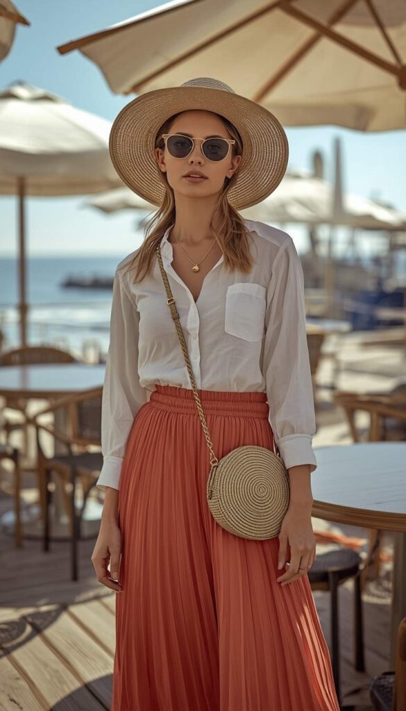 A coral-orange pleated midi skirt (elastic waist, side slit) paired with a white short-sleeve button-down shirt (rolled cuffs, chest pocket), styled with a wide-brimmed straw hat, tan espadrille sandals, and a circular raffia crossbody bag. The model stands on a seaside boardwalk—ocean glinting behind her, breeze lifting the hem, expression serene and joyful. The palette is warm, cohesive, and full of Hamptons charm—summer nostalgia, reimagined for real life.