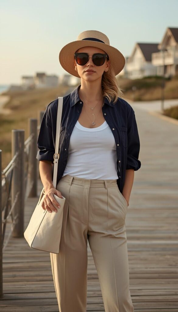 A navy-blue chambray shirt (notched collar, rolled sleeves) worn open over a white ribbed tank, paired with high-waisted beige wide-leg trousers (clean hem, subtle drape), styled with a wide-brimmed straw hat, tan leather slide sandals, and a structured cream crossbody bag. The model stands on a sun-dappled wooden boardwalk—coastal homes blurred behind her, breeze lifting her hair, expression calm and assured. The look is classic, breezy, and deeply wearable—like a slow afternoon in Cape Cod or Montauk.