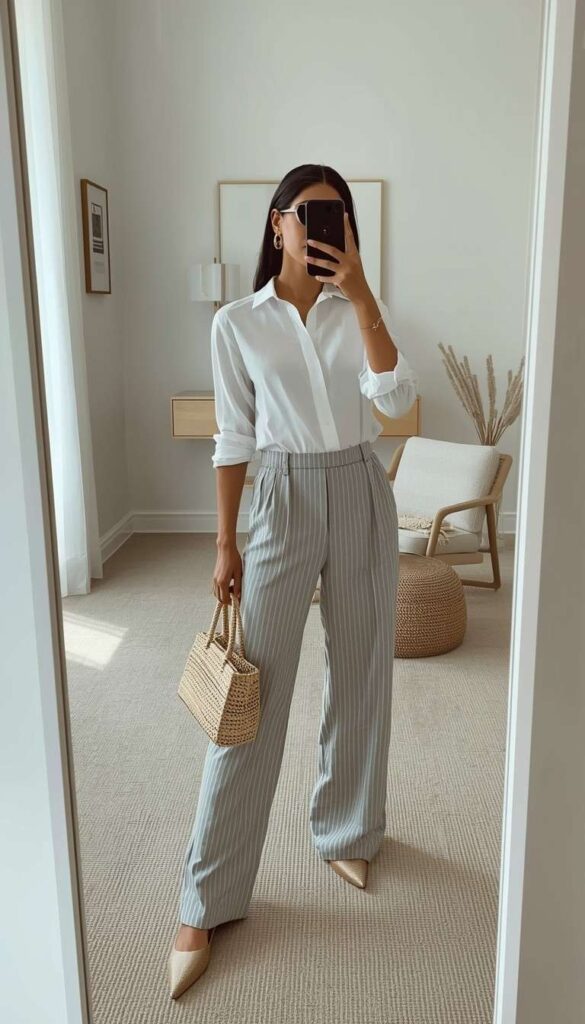 A white long-sleeve button-down shirt (classic collar, chest pocket) tucked into high-waisted grey-and-white vertically striped wide-leg trousers (ankle-length, sharp pleats), styled with gold pointed-toe pumps, a structured beige leather tote, and delicate gold hoops. The model takes a mirror selfie in a sun-drenched minimalist room—light wood floors, neutral tones, a woven ottoman beside her. The silhouette is polished, modern, and deeply confident—New York sophistication, distilled for summer heat.