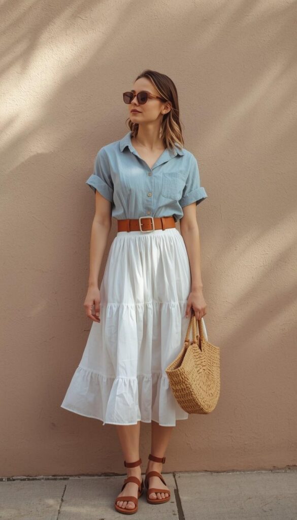 A light-blue chambray short-sleeve shirt (notched collar, rolled sleeves, chest pocket) worn open over a tiered white cotton midi dress (V-neck, ruffled hem), styled with a brown leather belt, tan flat sandals, and a woven circular raffia tote. The model leans against a warm-toned stucco wall—sunlight casting soft shadows, expression serene and grounded. The palette is classic New England: crisp, clean, and full of coastal calm—timeless without nostalgia.