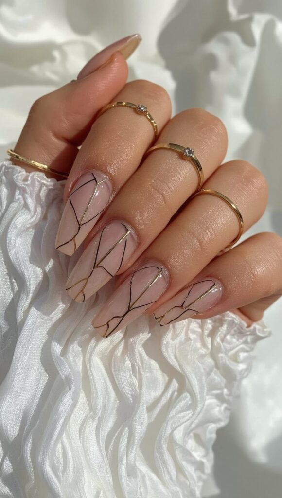 A soft nude base features black and gold cracked lines on each nail. The artistic detail adds a modern, elegant flair to the long, pointed shape.