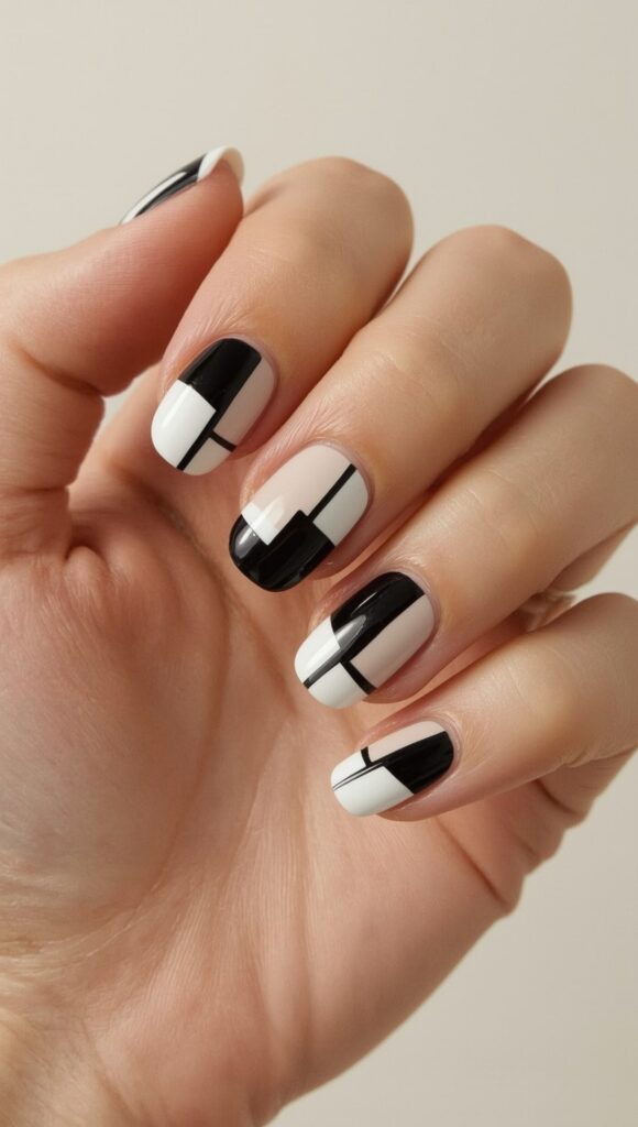 A mix of black and white blocks creates a minimalist geometric pattern on each nail. The sleek design adds a modern, architectural charm to the compact shape.