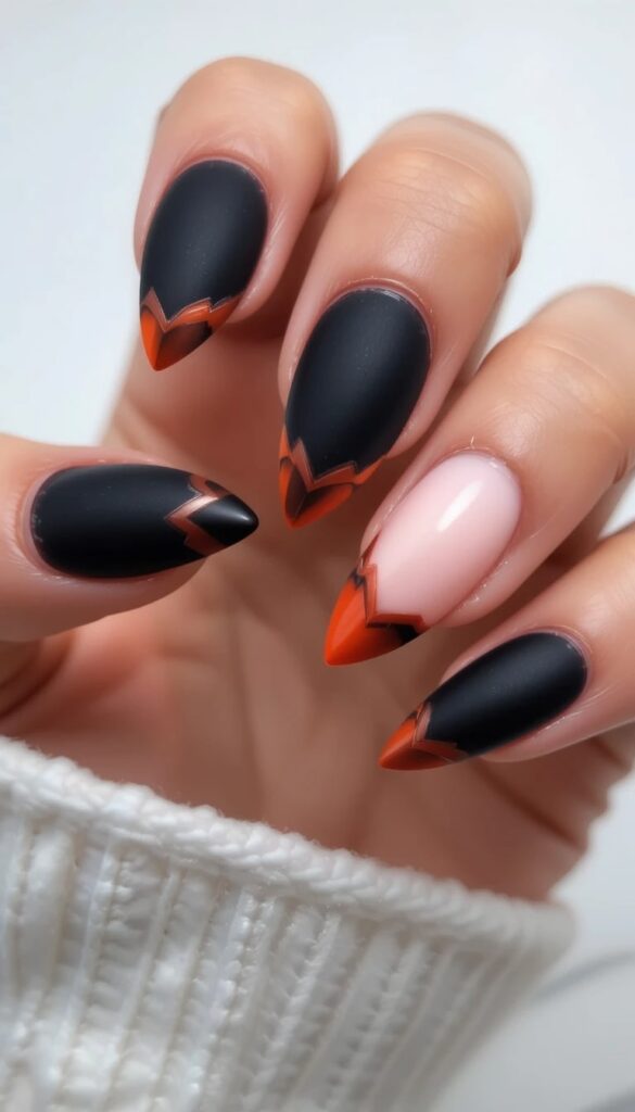 A sleek matte black base features orange tips with a sharp, angular design. The warm contrast adds a fiery, autumnal charm to the minimalist look.