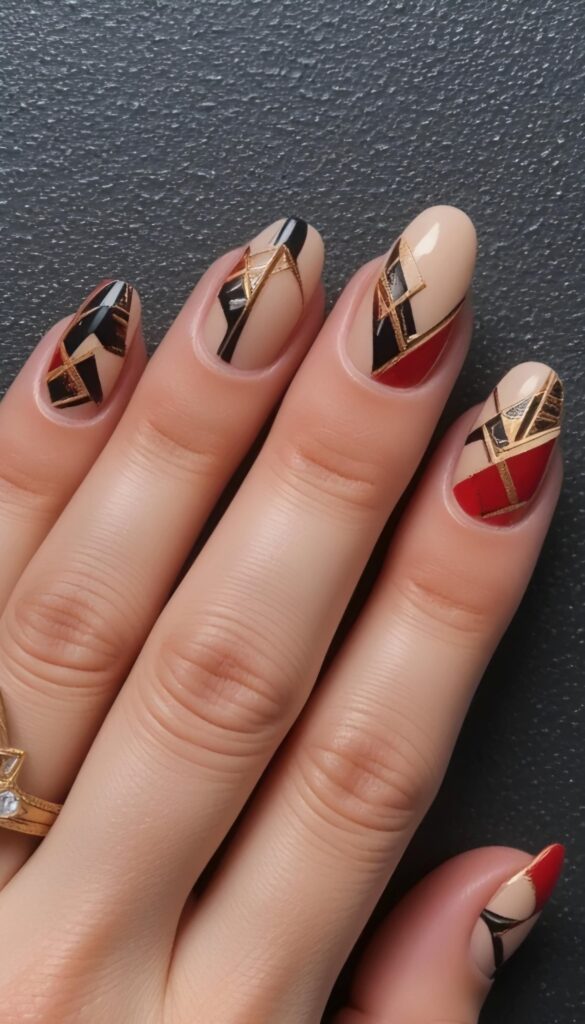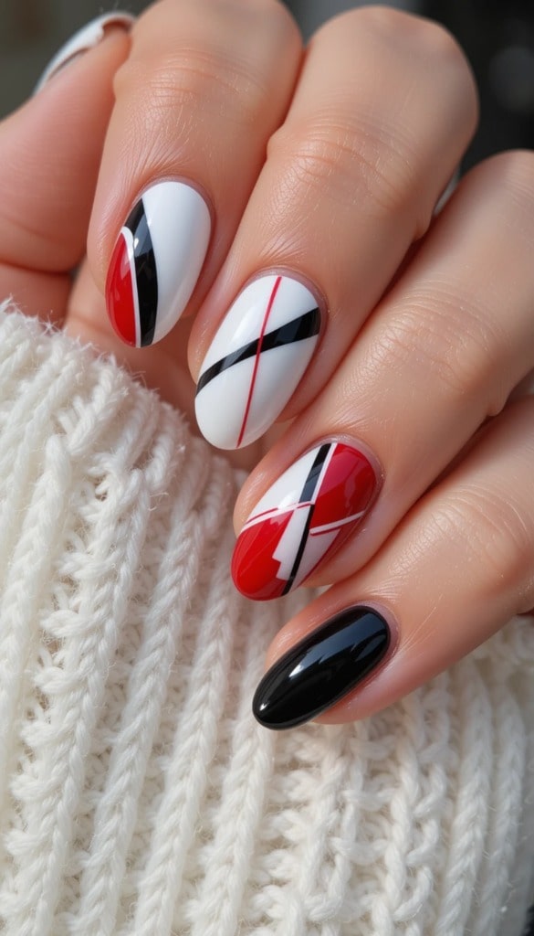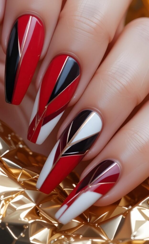 A mix of red, black, and white bases features bold geometric patterns on each nail. The striking contrast adds a luxurious, dramatic flair to the sleek design.