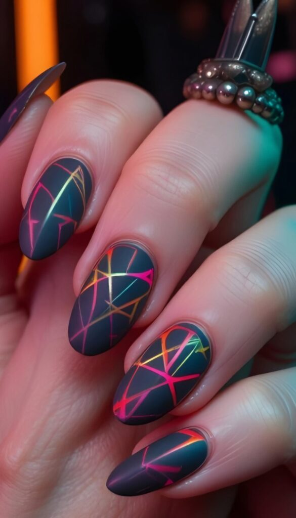A deep black base features neon pink, orange, and yellow geometric lines. The bold contrast adds a futuristic, vibrant charm to the dramatic design.