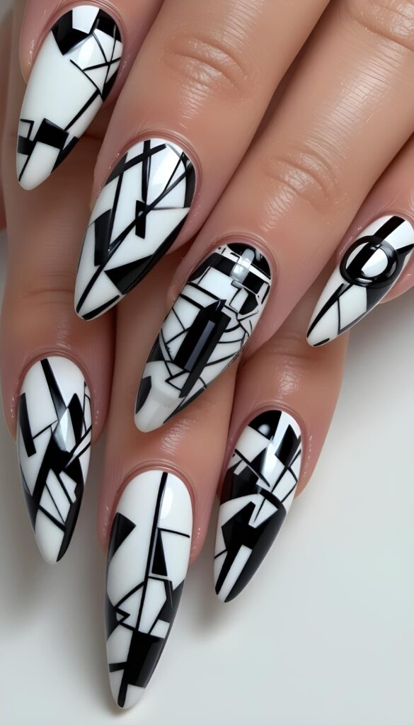 A bold black and white base features abstract geometric shapes on each nail. The dramatic contrast adds a modern, artistic flair to the long, pointed shape.