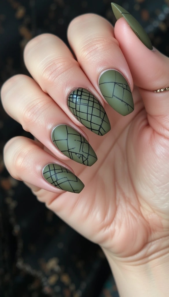 A rich olive green base features black grid lines on each nail. The subtle pattern adds a modern, minimalist touch to the sleek finish.