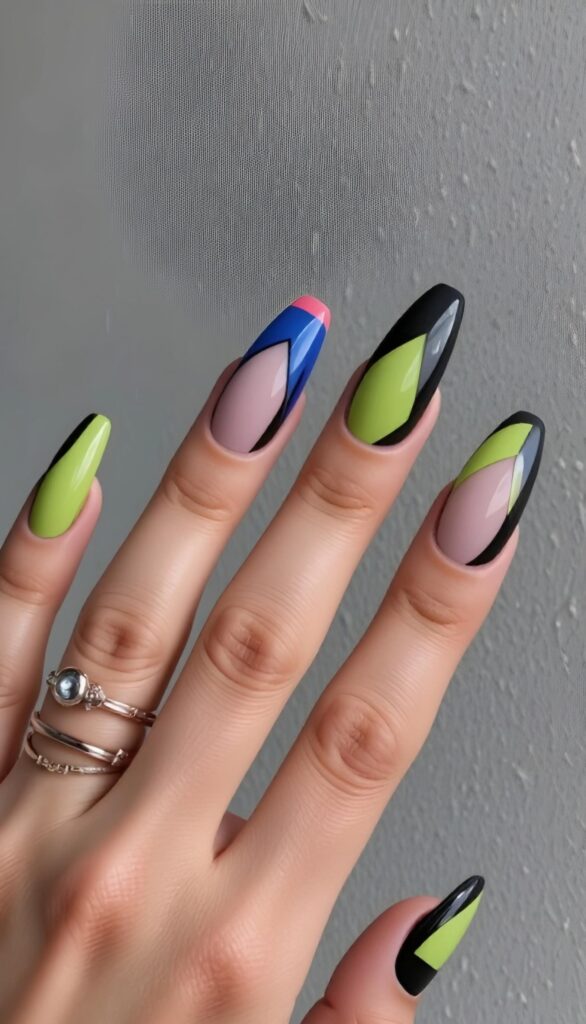 A mix of blue, green, pink, and black bases features abstract geometric shapes on each nail. The vibrant contrast adds a modern, colorful charm to the long, pointed shape.