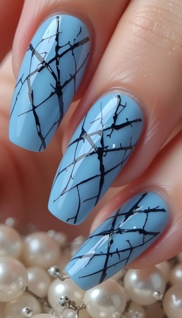 A soft blue base features black branch-like lines on each nail. The delicate detail adds a natural, autumnal charm to the clean finish.