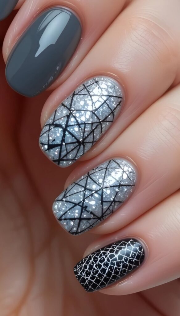 A soft gray base features silver glitter and black cracked lines on each nail. The bold contrast adds a modern, edgy flair to the sleek finish.