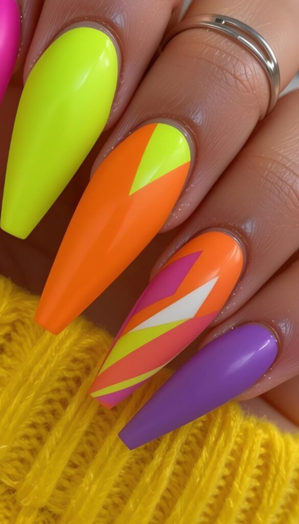 A mix of neon green, orange, pink, and purple bases features geometric color blocks on each nail. The vibrant contrast adds a playful, futuristic charm to the long, pointed shape.