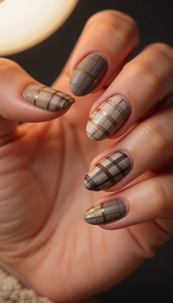 A soft gray base features plaid patterns with gold lines on each nail. The warm contrast adds a cozy, autumnal charm to the clean finish.