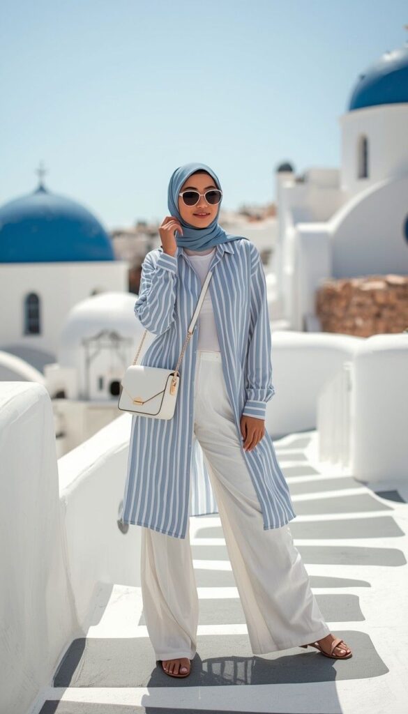 A long-sleeve light-blue-and-white vertically striped linen tunic (V-neck, relaxed fit) worn open over a white ribbed tank, paired with wide-leg ivory trousers and tan flat sandals. Styled with a soft blue hijab (loose drape), white crossbody bag, and round sunglasses. Held against whitewashed walls and iconic blue domes, the look is airy, timeless, and full of Mediterranean ease.