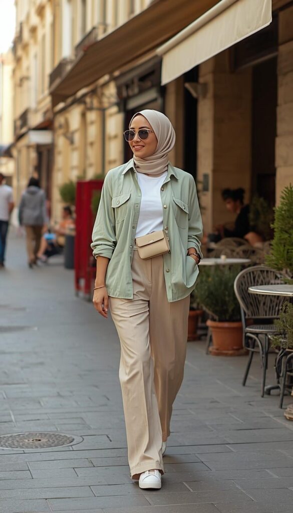 A lightweight sage-green utility shirt (notched collar, chest pockets, rolled sleeves) worn open over a white ribbed tank, paired with high-waisted beige wide-leg trousers and white platform sneakers. Styled with a neutral crossbody bag, round sunglasses, and a soft beige hijab (neatly pinned). The model walks down a European street—café tables blurred behind her. The look is practical, polished, and full of quiet confidence.
