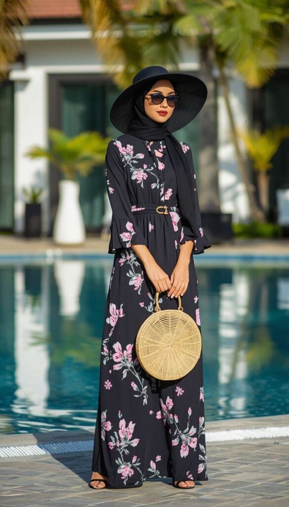A long-sleeve black maxi dress in lightweight crepe, covered in soft pink-and-ivory floral print, cinched at the waist with a gold-tone belt. Paired with a wide-brimmed black straw hat, a woven raffia circular tote, and flat leather sandals. Held beside a turquoise pool under palm trees, the look is bold yet balanced—modest, joyful, and deeply wearable.