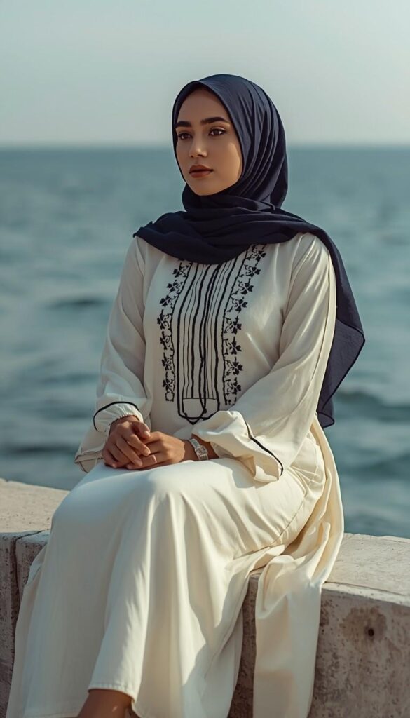 A flowing ivory linen-cotton abaya (V-neck, long sleeves, side slits) adorned with delicate black hand-embroidered florals down the front placket and cuffs. Paired with a deep navy hijab (neatly pinned, soft drape), a silver watch, and neutral block-heel sandals. Seated on a stone ledge overlooking the sea, the look is serene, refined, and deeply intentional—faith made visible through craft.