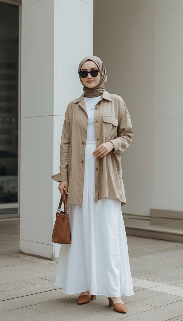 A relaxed-fit beige cotton shirt (button-front, chest pocket, rolled cuffs) tucked into a high-waisted white maxi skirt (flowy drape, clean hem), paired with a taupe hijab (neatly folded, soft folds at the neck). Styled with brown leather slide sandals, a structured tan tote, and a delicate silver chain. The model stands before modern architecture—light catching the fabric’s texture. The silhouette is clean, breathable, and deeply wearable—modesty as modern clarity.