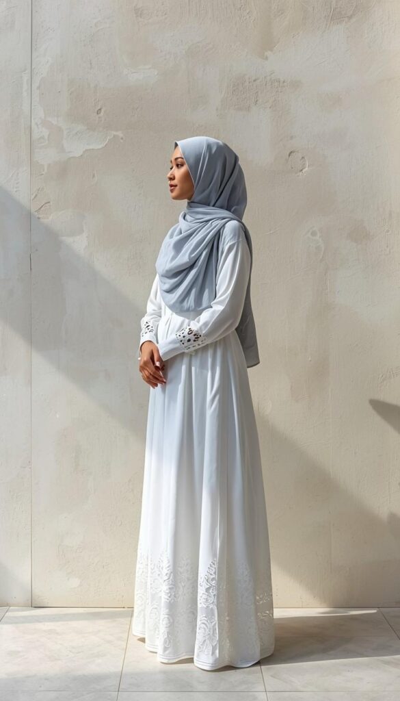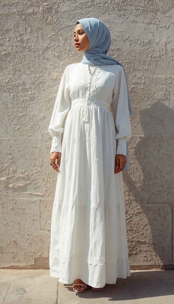 A long-sleeve white linen-cotton gown with intricate eyelet lace trim at the cuffs, hem, and neckline, cinched at the waist with a self-tie belt. Paired with a soft slate-blue hijab (lightly gathered at the neck), beige flat sandals, and a small pearl pendant. The model stands in profile against a sun-warmed stucco wall—the light highlighting the lace’s texture. Ethereal, grounded, and deeply intentional—faith expressed through craftsmanship.