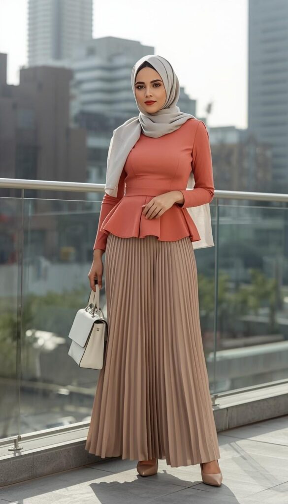 A fitted coral-peach peplum top (long sleeves, high neckline, structured waist) paired with a floor-length beige pleated maxi skirt (lightweight viscose, fluid drape). Styled with a two-tone hijab (soft grey draped over taupe), a structured white-and-cream tote, and nude block-heel sandals. The model stands on a glass-railed rooftop—city skyline blurred behind her, sunlight catching the pleats. Confident, modern, and full of quiet authority.
