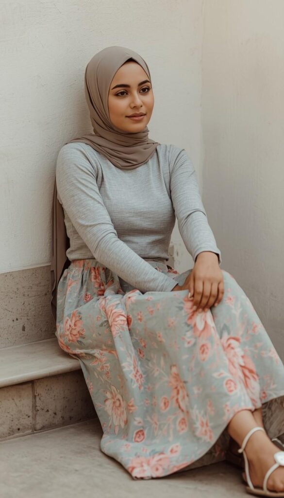 A long-sleeve grey ribbed knit top (high neckline, clean hem) paired with a flowing midi skirt in light sage base adorned with delicate pink-and-ivory floral print. Styled with a matching taupe hijab (loose drape), beige flat sandals, and a small gold ring. Seated on stone steps against a textured wall, the look is soft, grounded, and full of gentle harmony.