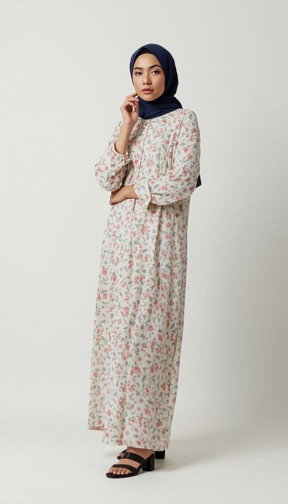 A floor-length ivory abaya in lightweight cotton-viscose blend, adorned with subtle pink-and-gray floral print and delicate pintuck detailing at the sleeves. Paired with a deep navy hijab (neatly draped, soft folds), black block-heel sandals, and minimal gold jewelry. The silhouette is fluid yet structured—modest, modern, and deeply wearable.