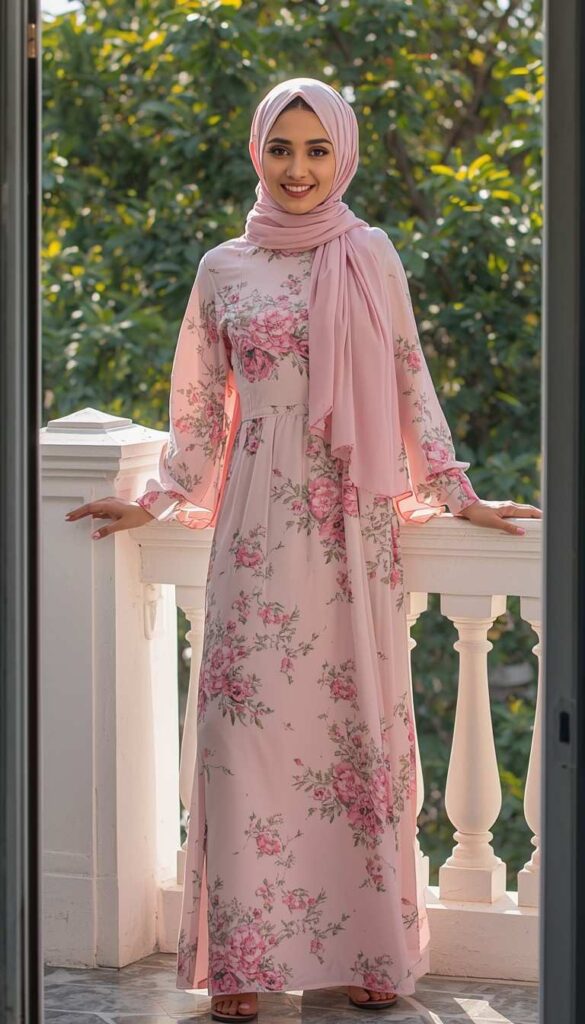 A knee-length pink chiffon maxi dress with delicate rose-and-green botanical print, V-neckline, and flared sleeves, worn with a matching dusty-pink hijab (softly draped, one side pinned at the shoulder). Styled with nude flat sandals, a gold chain necklace, and minimal earrings. The model leans on a white balcony railing—greenery behind her, light glowing on her smile. Romantic, serene, and full of quiet celebration.