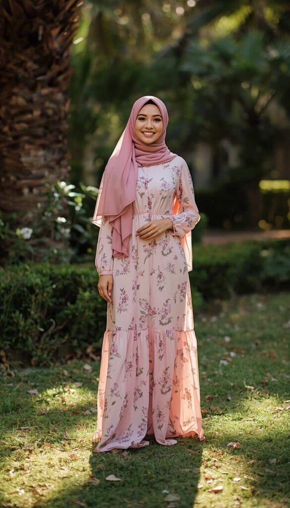 A tiered maxi dress in soft blush-pink chiffon, featuring delicate rose-and-green botanical print, V-neckline, and flared sleeves—worn with a matching dusty-pink hijab (loose drape, one side pinned at the shoulder). Styled with nude flat sandals and a delicate gold chain. Held in a sunlit garden with palm fronds and dappled light, the look is joyful, romantic, and full of serene movement.
