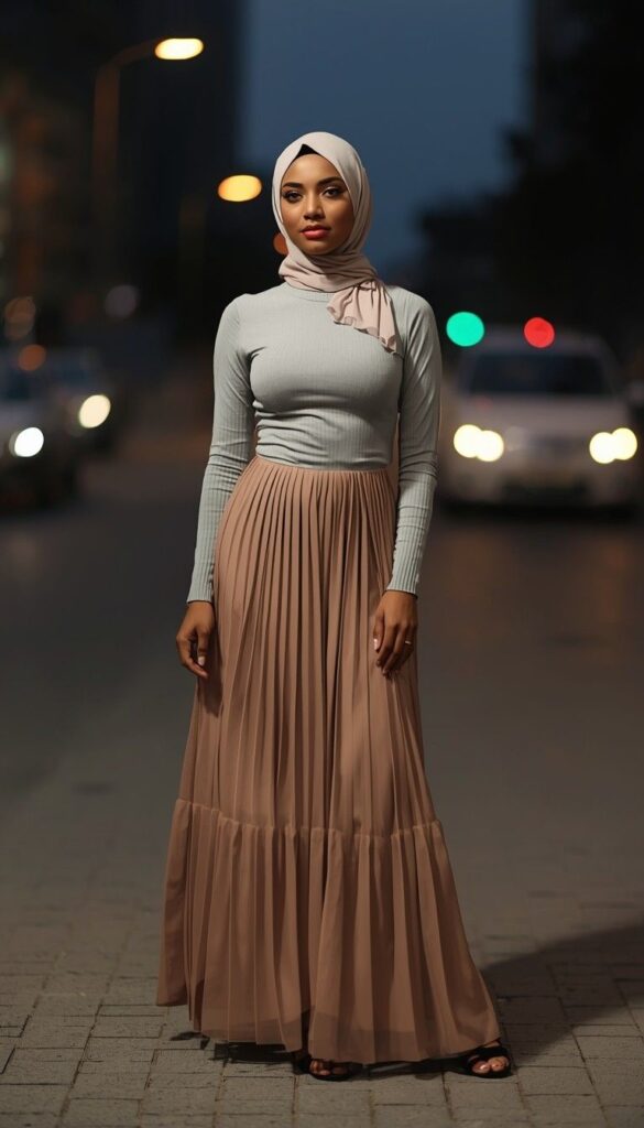 A ribbed sage-green long-sleeve top (high neckline, subtle texture) paired with a tiered taupe pleated maxi skirt (soft flow, ankle-length), styled with a matching taupe hijab (neatly pinned, one side draped over the shoulder). Barefoot on a city street at dusk, car lights glowing softly behind her. The look is serene, grounded, and deeply wearable—modesty that breathes with the night.