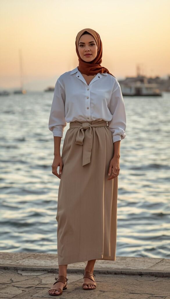 A crisp white cotton button-down shirt (long sleeves, rolled cuffs) tucked into a high-waisted camel midi skirt (pleated front, self-belt tie), paired with a rust-brown hijab (soft drape, knotted at the nape). Styled with tan leather slide sandals and a delicate gold ring stack. The model stands on a seaside promenade as the sun dips—water shimmering behind her. The look is polished, breathable, and full of calm authority.