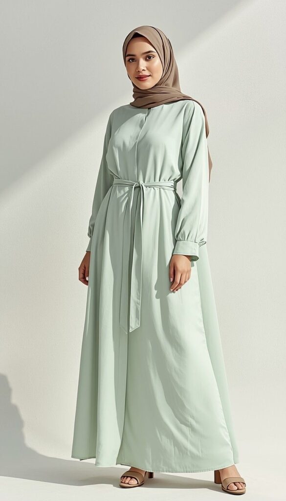 A floor-length mint-green satin-blend gown with long sleeves, self-tie waist belt, and subtle sheen—paired with a matching muted sage hijab (soft drape, knotted at the nape). Styled with tan block-heel sandals and a delicate gold pendant necklace. The model stands against a clean white backdrop—sunlight highlighting the fabric’s fluid movement. Calm, cohesive, and deeply intentional—like stillness made visible.