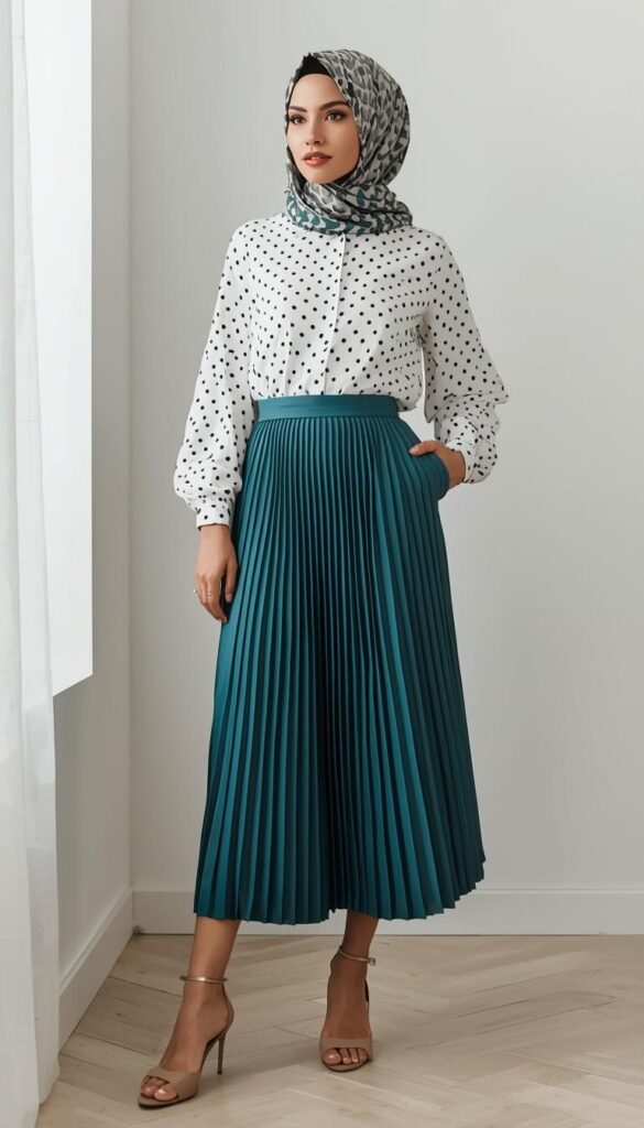 A white long-sleeve blouse adorned with delicate black polka dots (puffed sleeves, button-front), paired with a vibrant emerald-green pleated midi skirt (structured waist, flowing hem). Styled with a patterned hijab (teal-and-grey geometric print), tan block-heel sandals, and a gold ring stack. The model stands in a sunlit interior—light streaming through sheer curtains. Bold, joyful, and full of artistic confidence—modesty reimagined with playfulness and power.
