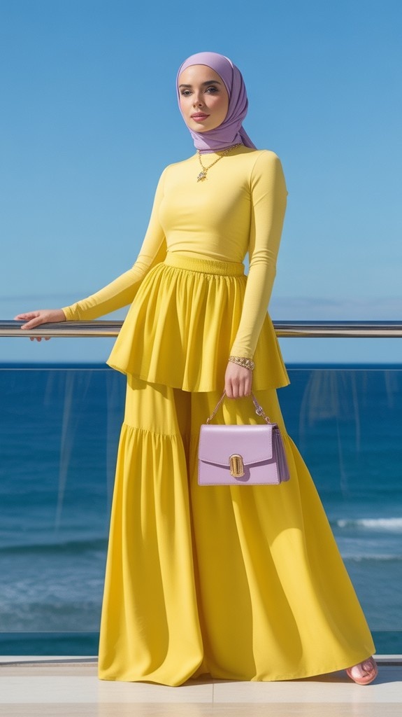 A vibrant butter-yellow long-sleeve modest top (ribbed knit, high neckline) paired with a tiered peplum skirt in matching yellow, both in lightweight viscose. Styled with a soft lilac hijab (draped loosely, pinned at the neck), a lavender structured mini bag, and tan leather slide sandals. The model stands on a seaside balcony—azure sky behind her, breeze lifting the hem. Joyful, cohesive, and full of summer radiance.