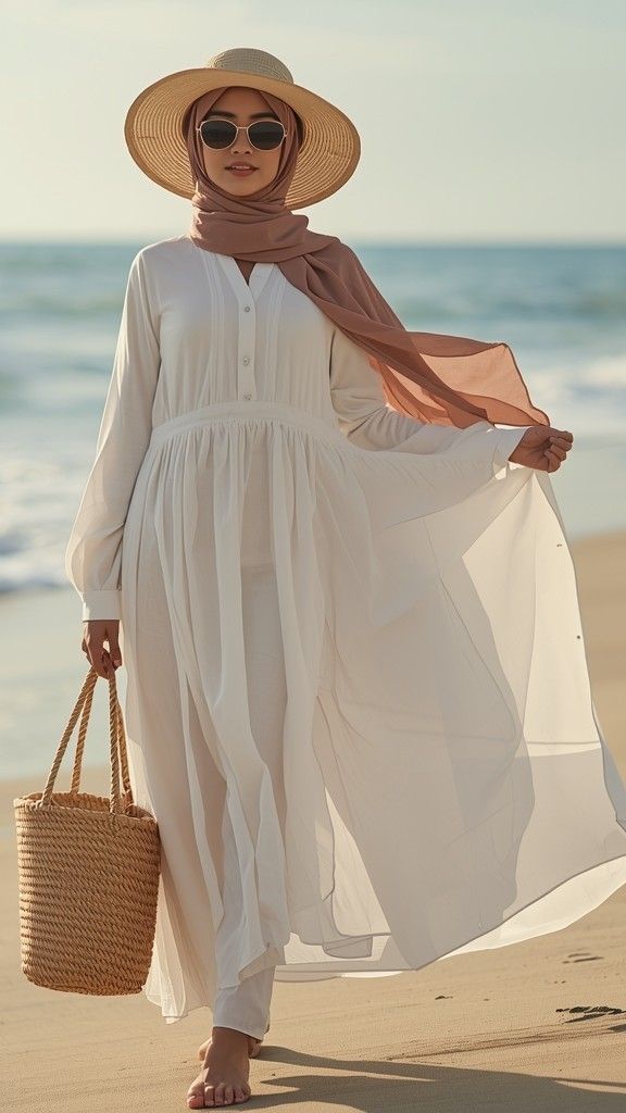 A flowing ivory linen-cotton maxi dress (V-neck, long sleeves, side slits) paired with a soft taupe hijab (draped loosely, one end trailing), a wide-brimmed woven straw hat, and bare feet on sun-warmed sand. Styled with a raffia tote and minimal gold earrings, the look is ethereal, breezy, and deeply peaceful—like grace walking toward the sea.