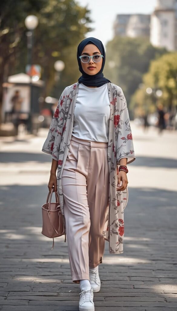 A white ribbed tank top layered under a sheer floral-print kimono jacket (ivory base, red-and-gray blossoms, wide sleeves), paired with high-waisted blush tailored trousers and white platform sneakers. Styled with a navy hijab (neatly pinned), light-blue cat-eye sunglasses, a mauve crossbody bag, and stacked beaded bracelets. The model walks down a cobblestone street—sunlight catching the fabric’s flow. Contemporary, confident, and deeply wearable—modesty reimagined for the city.