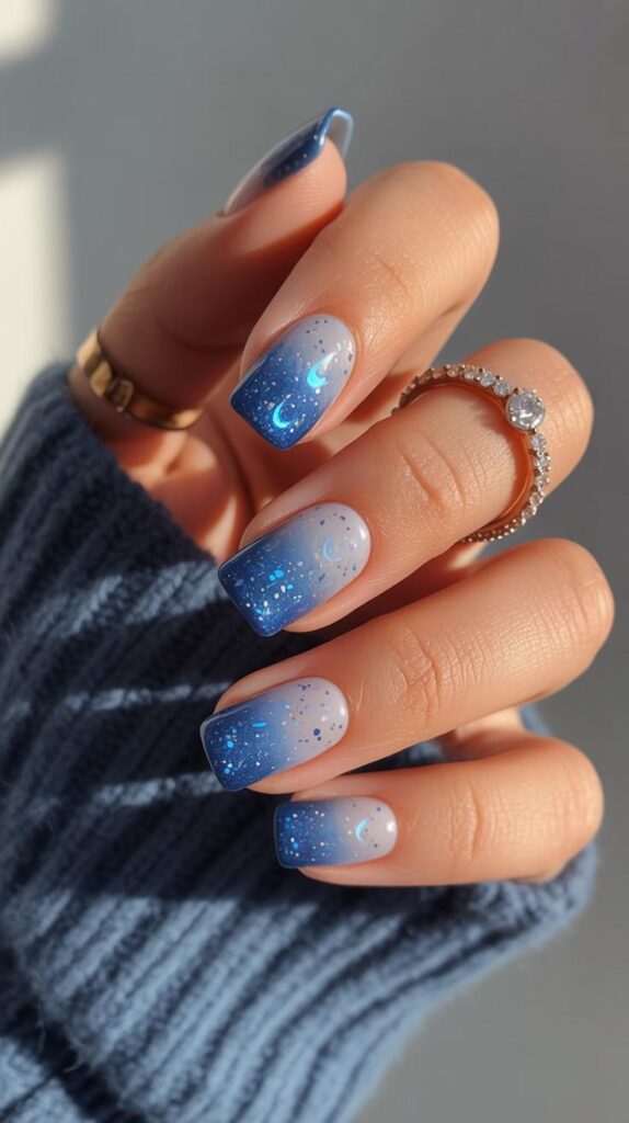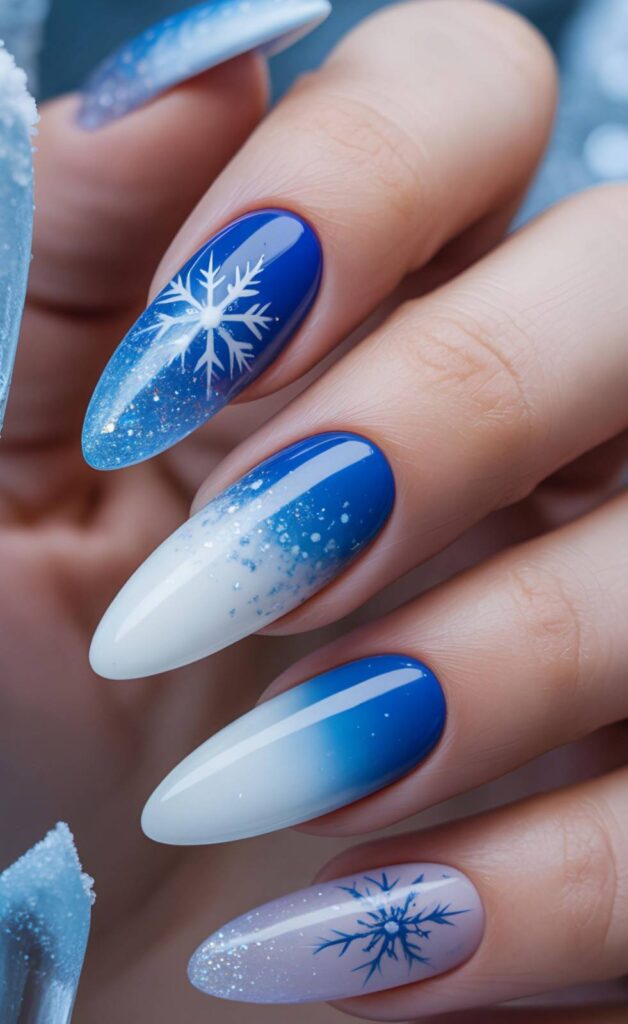 Deep royal blue fades into soft white, while each nail features delicate white snowflakes — like a winter storm captured in miniature. The glossy finish catches every glint of light, making it perfect for evening events or snowy strolls. Paired with a snowy backdrop, this design whispers ‘cosmic magic’ with every gesture.