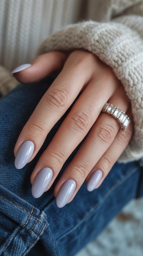 Soft dusty blue polish gleams with high-gloss shine — like a fresh winter breeze captured in miniature. The crisp contrast makes it pop without overpowering your look, perfect for cozy nights in or festive gatherings. Paired with denim cuffs, this design whispers ‘casual magic’ with every step.