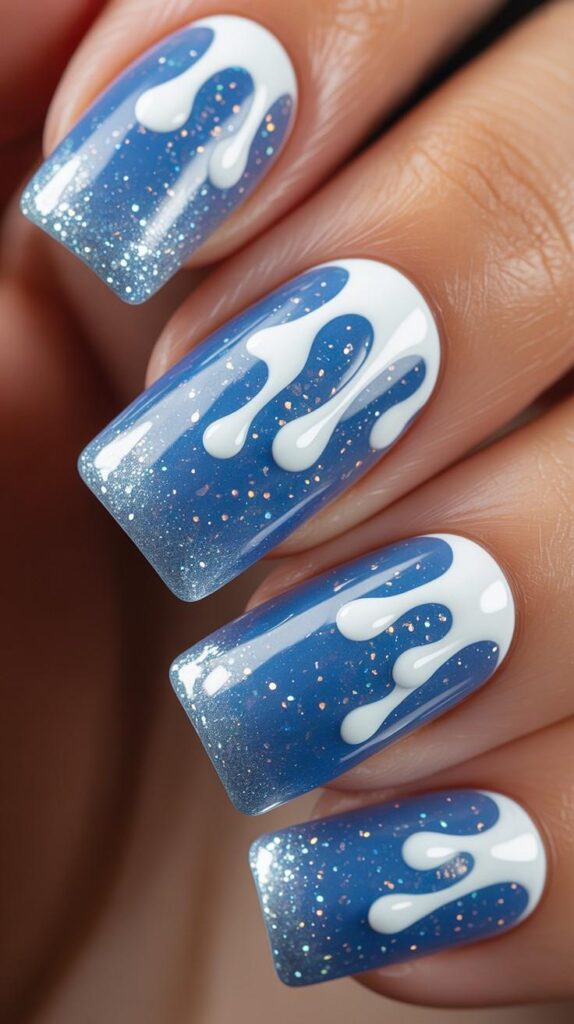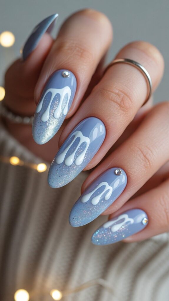Soft ice blue polish shimmers with delicate glitter, while each nail features bold white ‘drip’ accents — like melted snow captured in miniature. The glossy finish catches every glint of light, making it perfect for cozy nights in or festive gatherings. Paired with a soft knit sweater backdrop, this design whispers ‘icy magic’ with every glance.