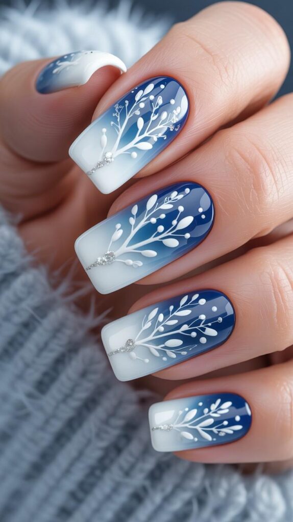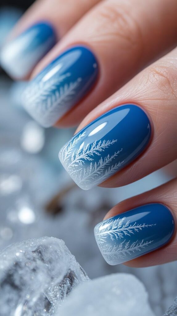 Deep royal blue fades into soft white, while each nail features delicate frost patterns — like a winter storm captured in miniature. The glossy finish catches every glint of light, making it perfect for evening events or snowy strolls. Paired with a snowy backdrop, this design whispers ‘cosmic magic’ with every gesture.