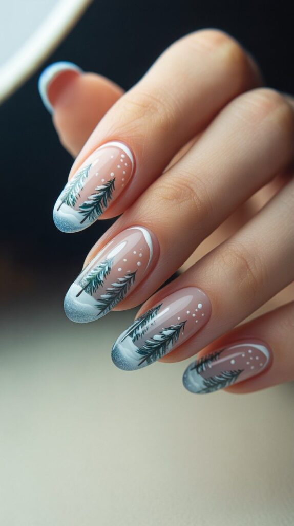 Clean nude polish meets crisp green pine trees — modern, chic, and perfect for showing off your winter boots. The matte-to-glossy gradient adds depth, while the minimalist base lets the design shine. Paired with real snowflakes, this design whispers ‘minimalist magic’ with every step.