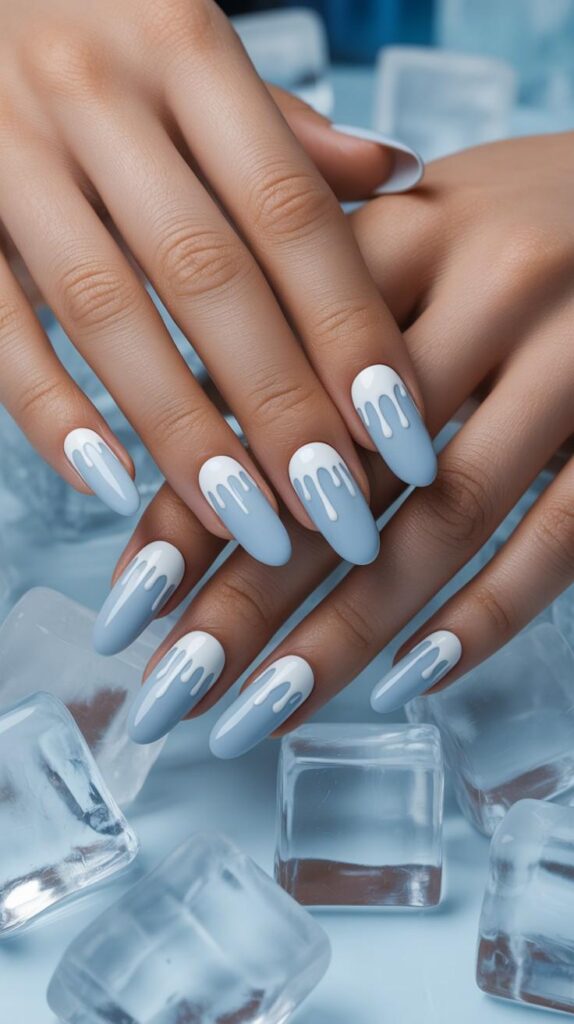 Clean ice blue polish meets bold white ‘drip’ accents — modern, chic, and perfect for showing off your winter boots. The matte-to-glossy gradient adds depth, while the minimalist base lets the design shine. Paired with real ice cubes, this design whispers ‘minimalist magic’ with every step.