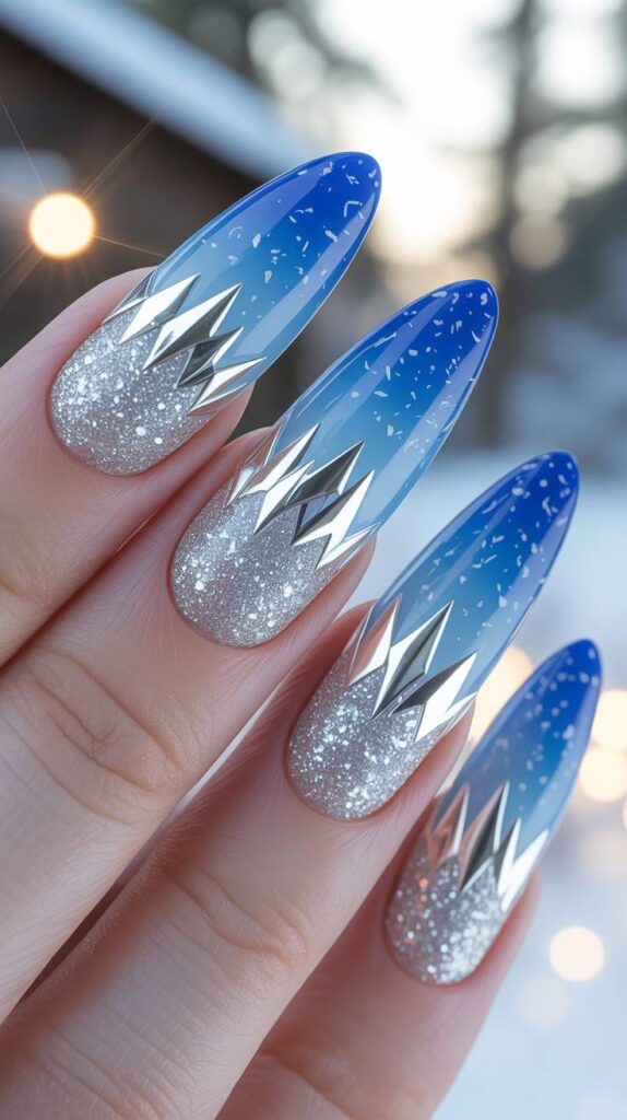 Deep royal blue polish shimmers with cosmic glitter, while each nail features bold silver spike accents — like a frozen storm captured in miniature. The glossy finish catches every glint of light, making it perfect for evening events or snowy strolls. Paired with twinkling lights, this design whispers ‘cosmic magic’ with every gesture.