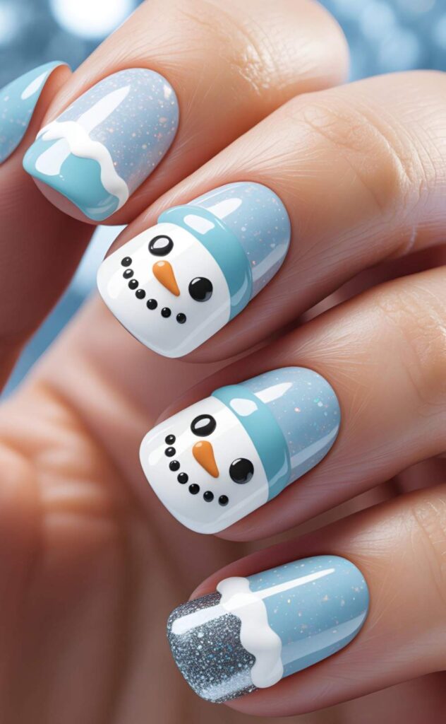 Soft baby blue polish meets playful snowmen peeking out from two nails — like a winter wonderland come to life. The glossy finish catches every glint of light, making it perfect for family gatherings or cozy Christmas mornings. Paired with twinkling lights, this design whispers ‘festive glam’ with every step.