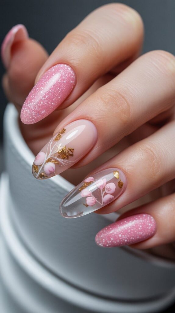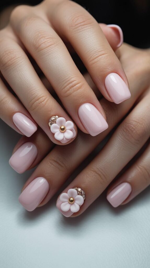 Sheer nude-pink short almond nails featuring 3D mini pink blossoms, gold-leaf accents, and fine green stems — tactile, romantic, and deeply dimensional. The glossy topcoat unifies the look, and the compact shape ensures durability through daily life. A bouquet, preserved in polish.