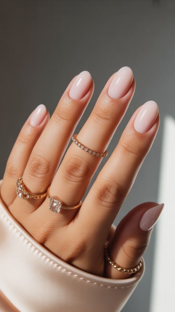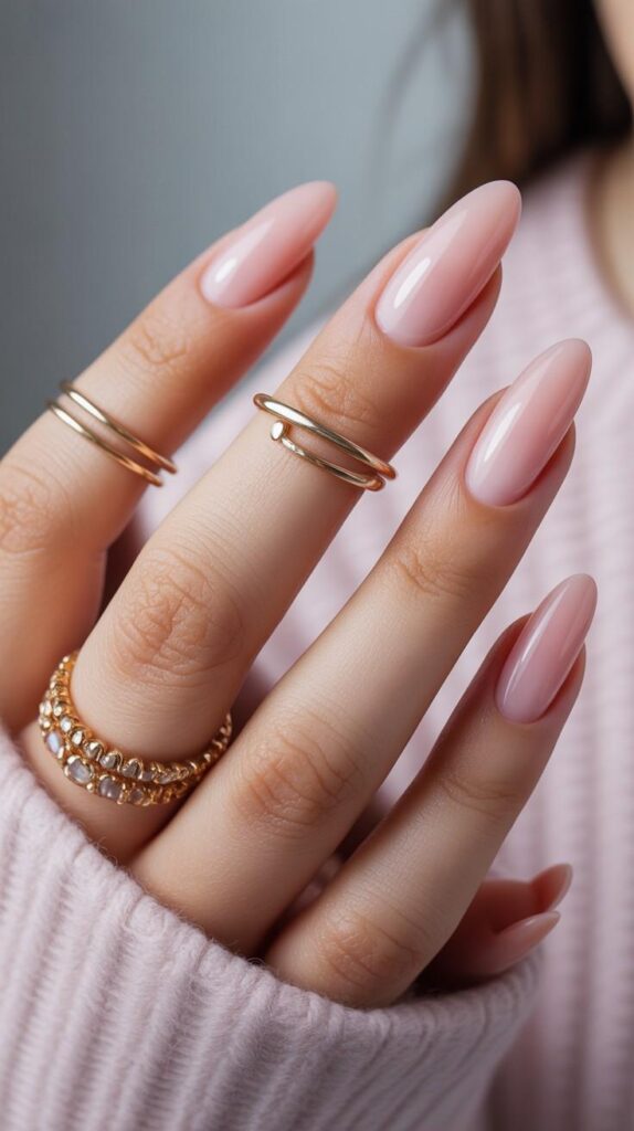 Glossy light pink short almond nails paired with delicate stacked gold rings — clean, modern, and full of quiet luxury. The high-shine finish enhances the skin-like luminosity, and the compact shape ensures all-day comfort. Elegance, unadorned.