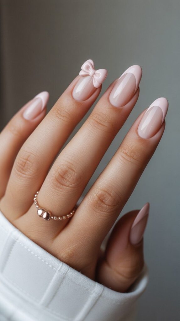 Glossy light pink short rounded-square nails with one accent finger showcasing a raised 3D pale pink bow at the tip’s curve — sweet, chic, and full of playful refinement. The high-shine finish enhances the dimension, and the compact shape ensures comfort for typing, hugging, or holding coffee. Joy, wrapped in ribbon.