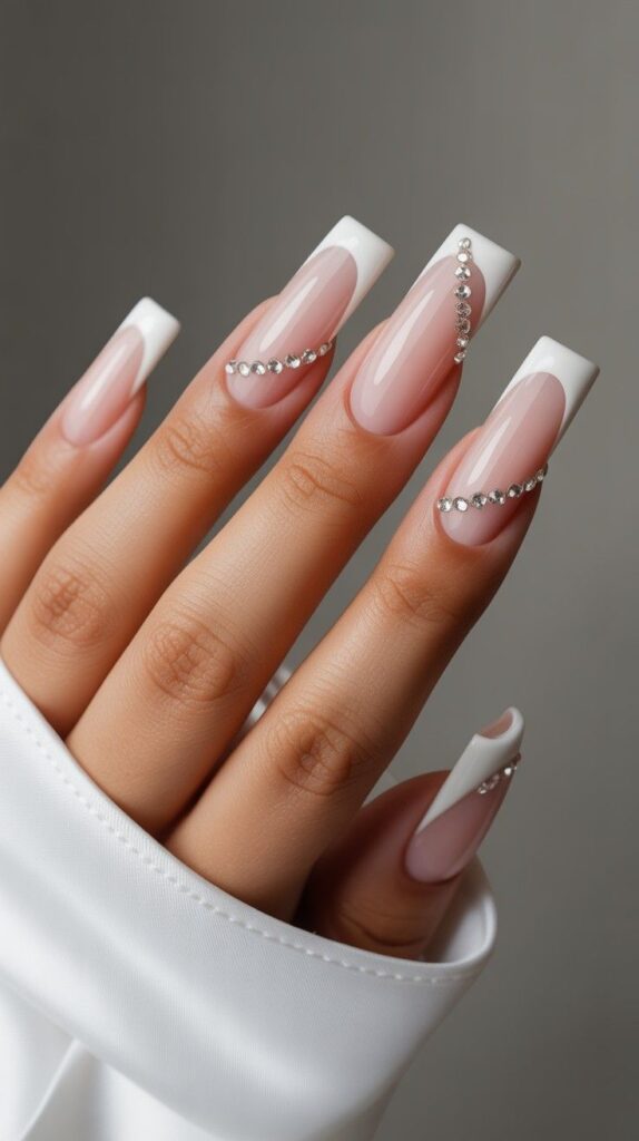 Glossy light pink short squoval nails with crisp white French tips adorned by delicate arcs of micro clear rhinestones — elegant, modern, and full of quiet luxury. The high-shine finish enhances the sparkle, and the compact shape ensures all-day wearability. Romance, redefined.