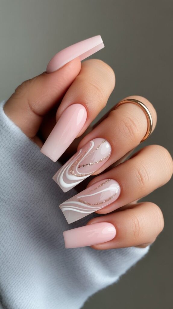 Smooth matte-light-pink long coffin nails with fluid white-and-gold marbled swirls — delicate, dynamic, and full of movement. The satin finish adds modern depth, and the sharp shape balances drama with wearability. Softness, with intention.