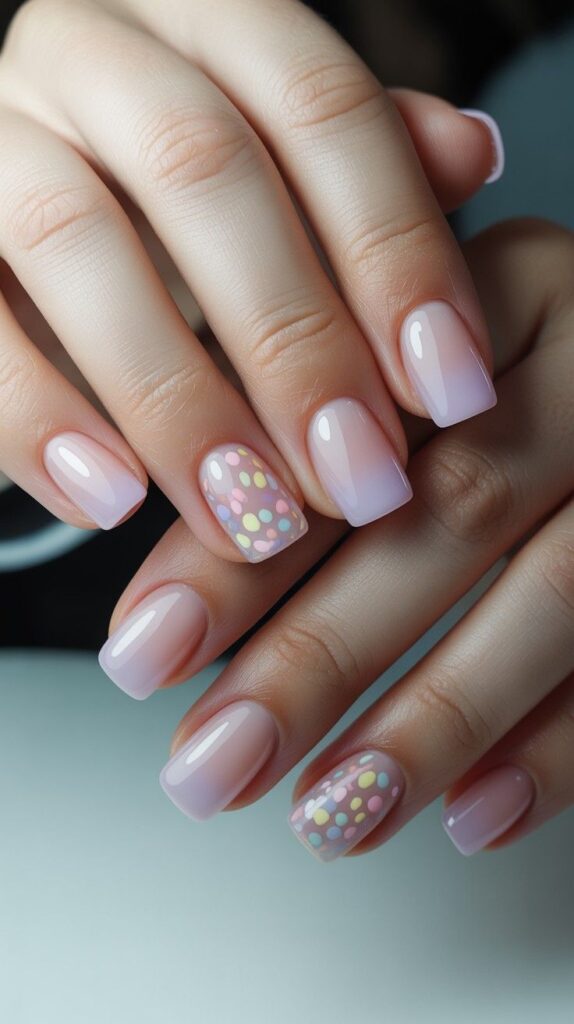 Sheer blush short almond nails with two accent fingers adorned with playful multi-tone confetti dots (pink, mint, lemon, lavender) — like scattered candy on a spring morning. The glossy finish enhances the whimsy, and the short length keeps it practical for daily life. Joy, fragmented and sparkling.