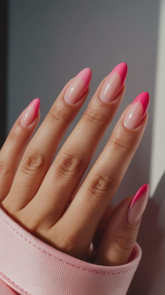 Soft blush base short oval nails with bold, saturated hot-pink French tips — vibrant, confident, and full of joyful contrast. The glossy finish makes the gradient seamless, and the short length keeps it surprisingly wearable. Softness, with fire.